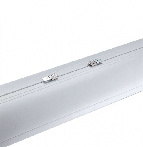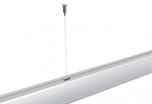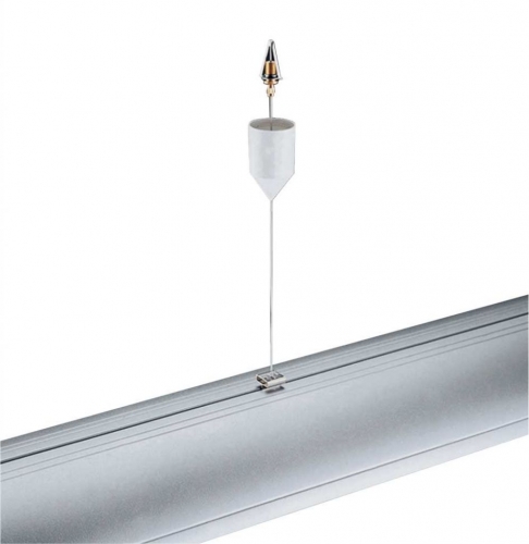 Completo di accessori per fissaggio a sospensione; 2 fili di acciaio; 2 ganci di acciaio zincato; 2 morsetti blocca cavo per regolazione millimetrica dell'altezza; 2 rosoni coprifilo a soffitto in ABS di colore bianco.