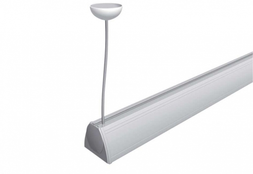 Completo di accessori per alimentazione a sospensione: 1 staffa di fissaggio; 1 cavo di alimentazione trasparente con morsetto; 1 rosone coprifilo a soffitto in ABS di colore bianco o grigio (GR).