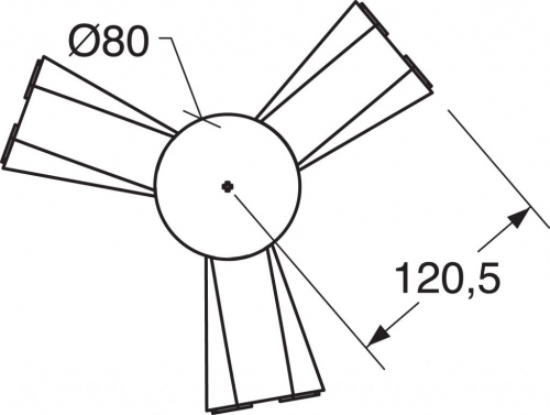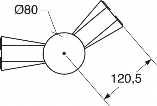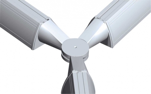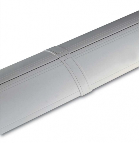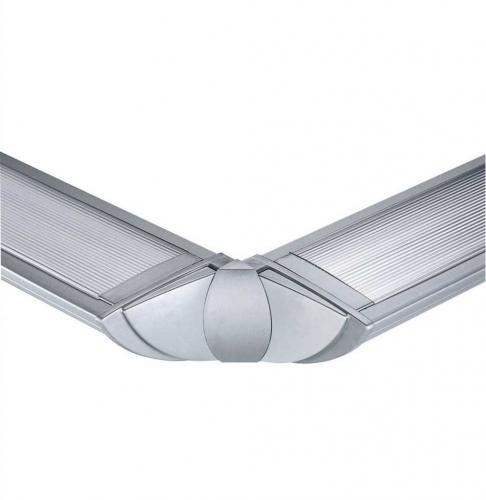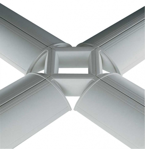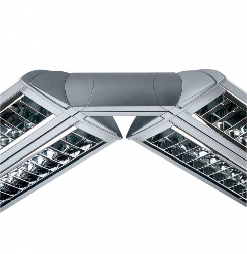 Giunto angolare snodato per 3 apparecchi monolampada e bilampada in policarbonato bianco o grigio. L'angolo minore nel caso di apparecchi bilampada è di 88°, nel caso di apparecchi monolampada è di 62°.