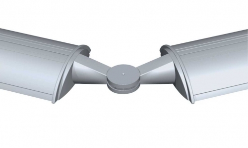 Giunto angolare snodato per 2 apparecchi monolampada e bilampada in policarbonato bianco o grigio. L'angolo minore nel caso di apparecchi bilampada di 88°, nel caso di apparecchi monolampada di 62°.
