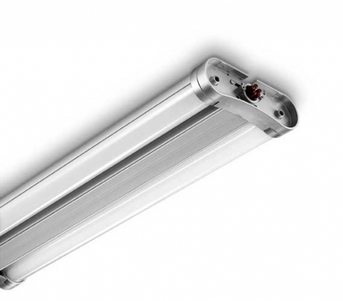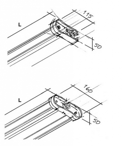 Apparecchi LED RGB 24V per fila continua, completi di schermo diffondente, da completare con alimentatori/centraline di controllo remoti e tappi di chiusura. Installabili a sospensione, a plafone o a parete.