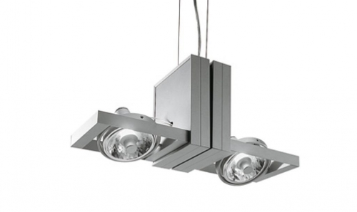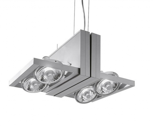 Apparecchio in alluminio e lamiera verniciati di colore grigio RAL 9006 per lampade a ioduri metallici CDMR111 orientabili.