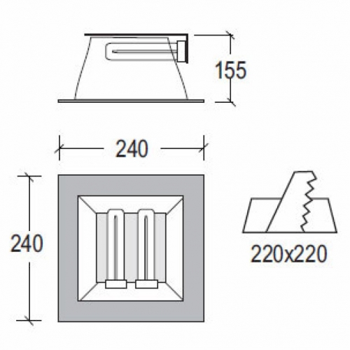 Recessed fittings with aluminium frame for compact fluorescent lamps, complete with accessories for diffuser.